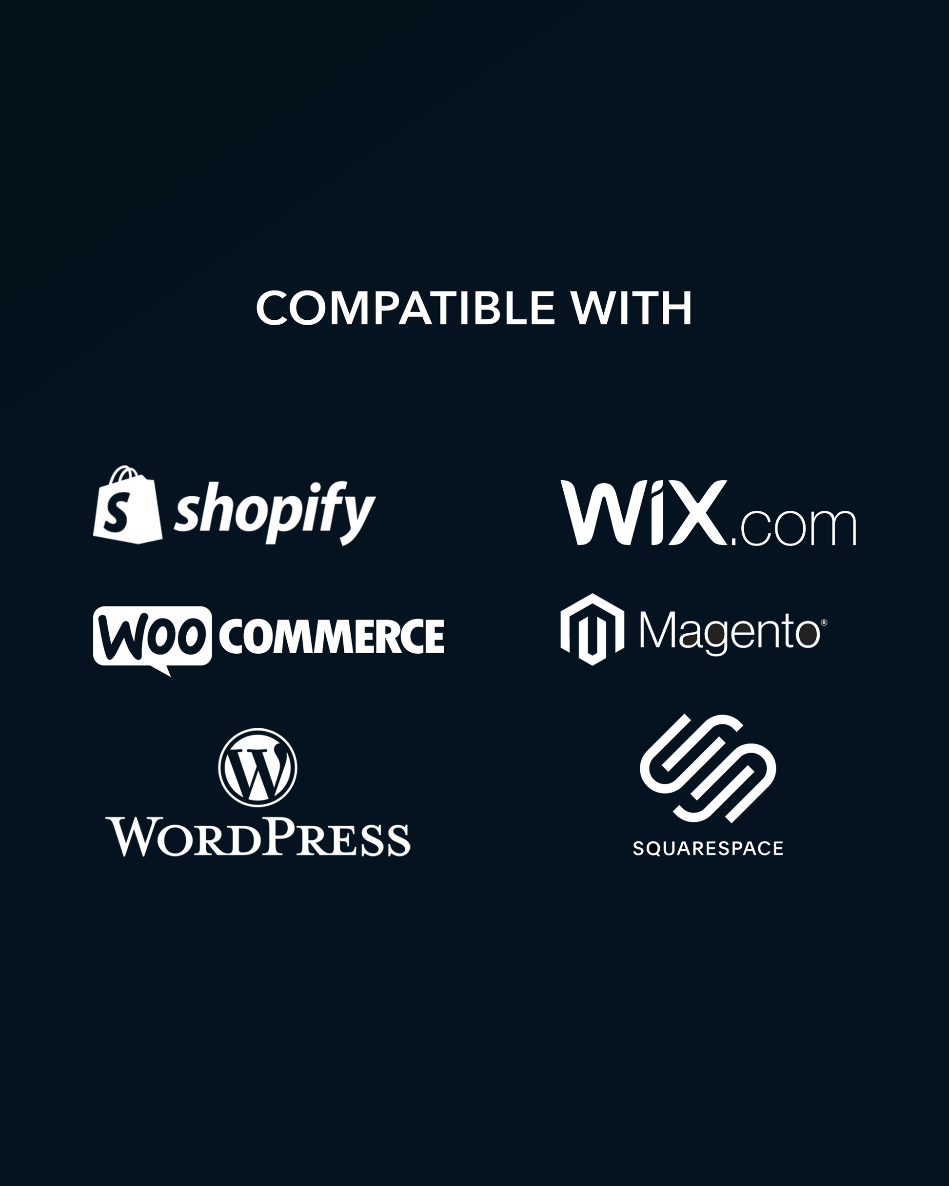It's universal and works for all eCommerce platforms, such as Shopify, WooCommerce, Magento, Squarespace, Wix, Wordpress, Ecwid, Adobe Commerce and so on.